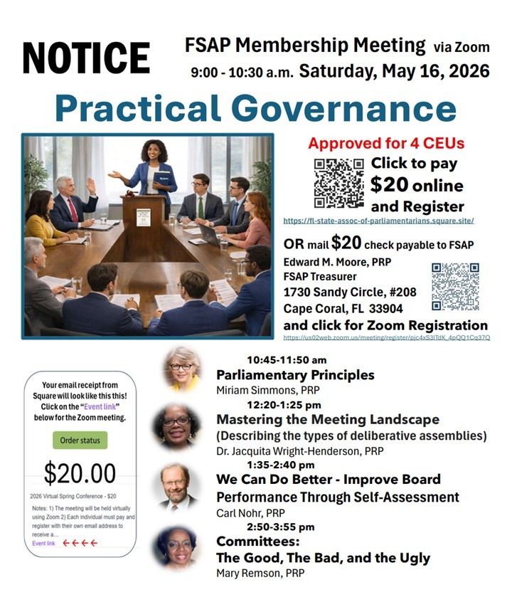 Florida parliamentarians provide expertise in managing effective and efficient business meetings, developing and interpreting bylaws and rules of order, applying parliamentary procedure in practice, presiding professionally, and offering consultation on parliamentary issues.